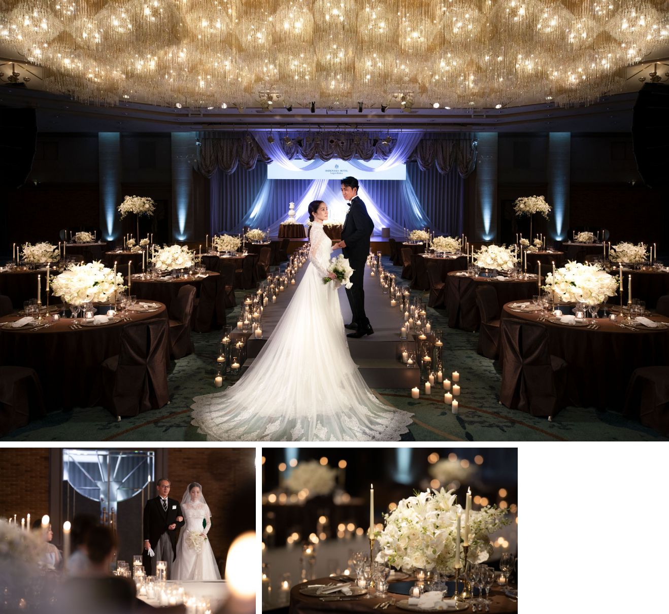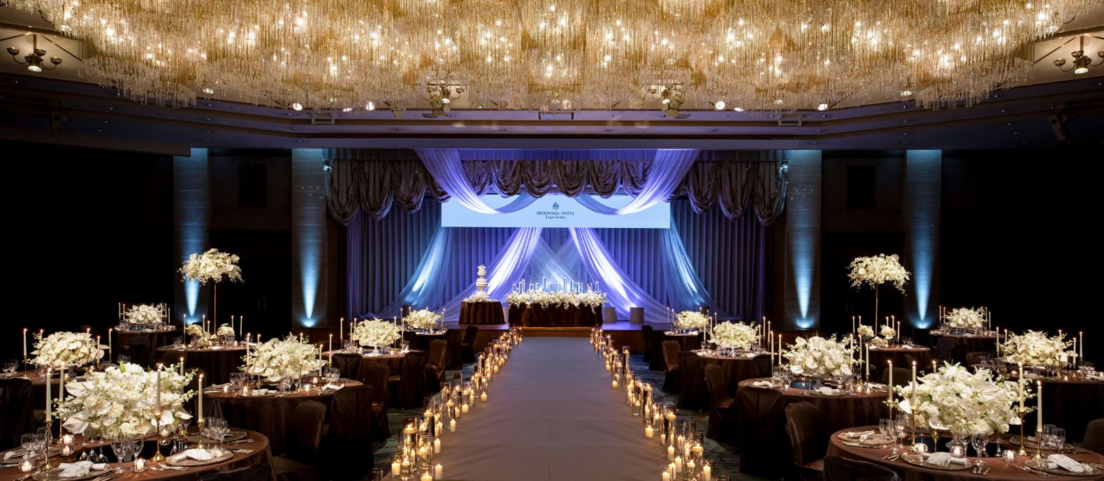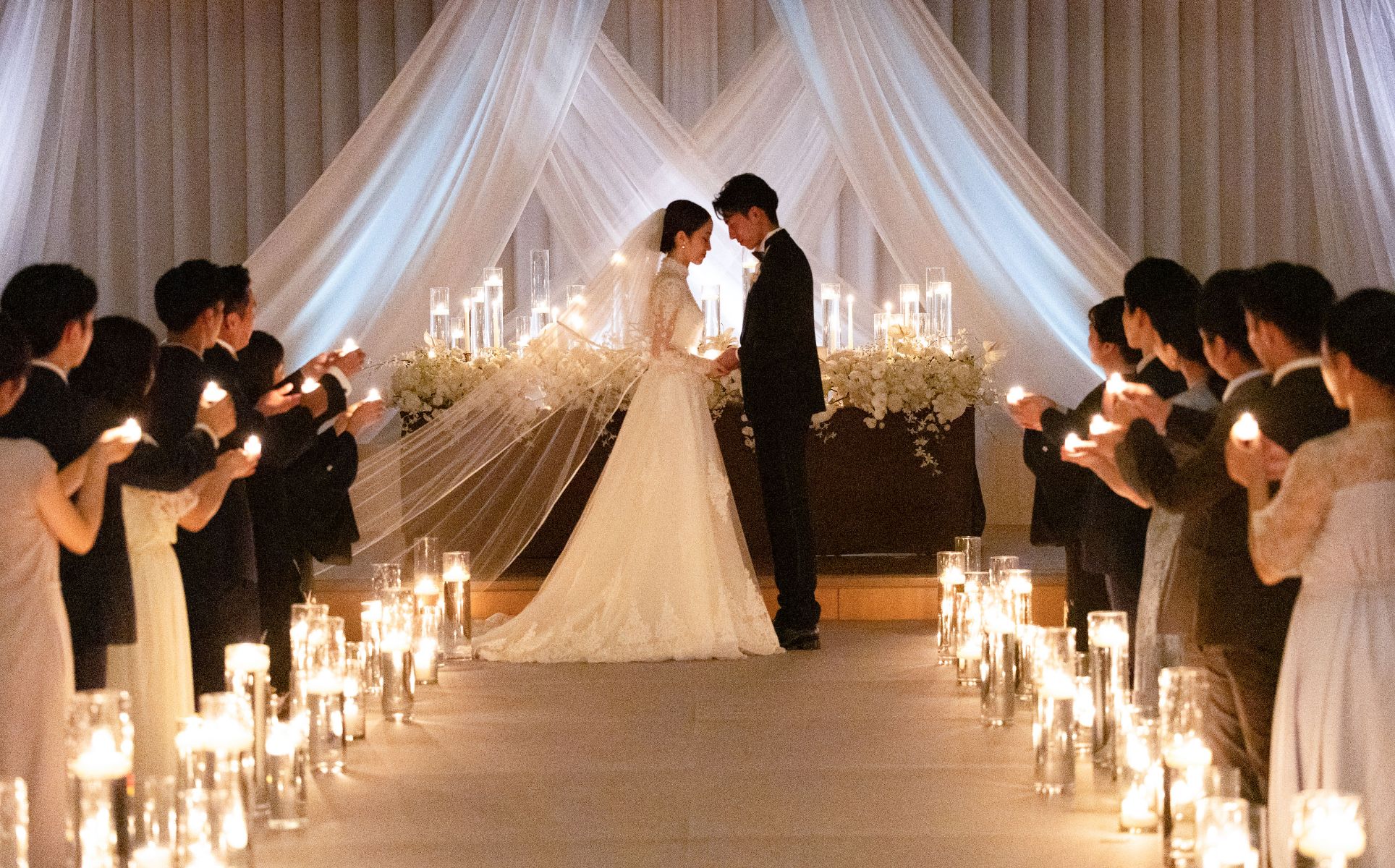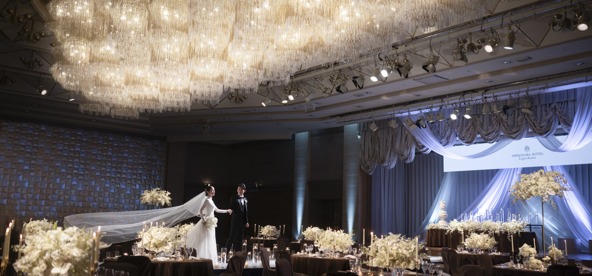 煌めくシャンデリアと広々とした空間に包まれ、ゲストの祝福のもとで誓いを立てる、格式と温かさが調和したセレモニー。